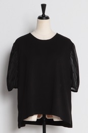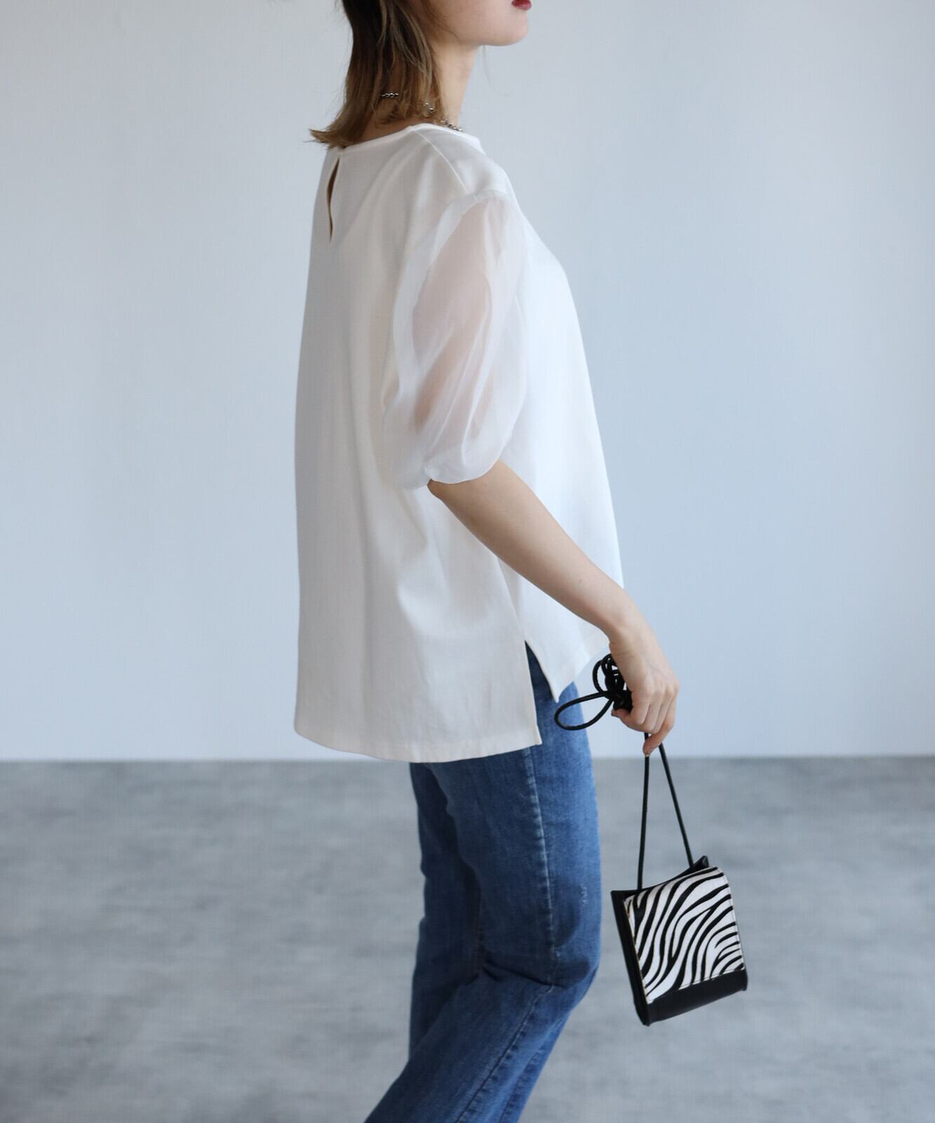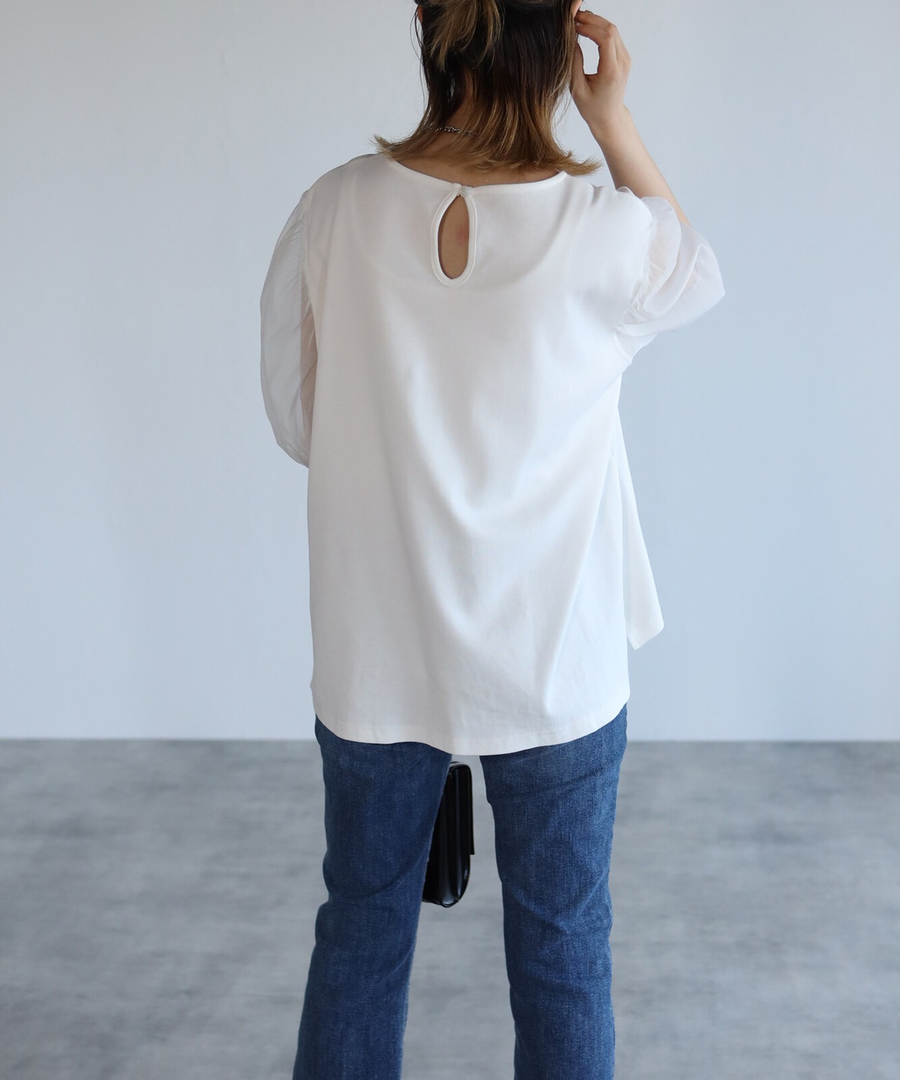 綿のTシャツ素材を主体に、パフスリーブ部分だけをふわりとした質感のシアー素材に切り替えた女性らしいデザインです。